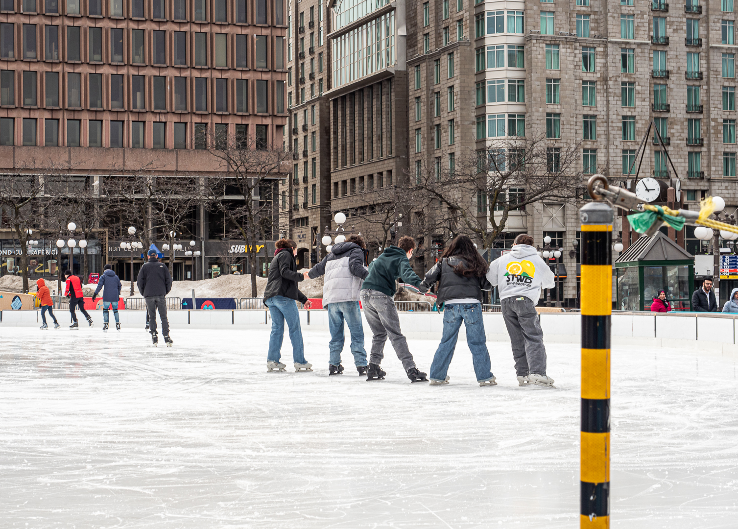 Il est interdit de faire des courses, patiner à des vitesses excessives, patiner avec un enfant sur le dos ou dans les bras, de former une chaîne, de jouer à la tague ou de lancer des balles de neige.